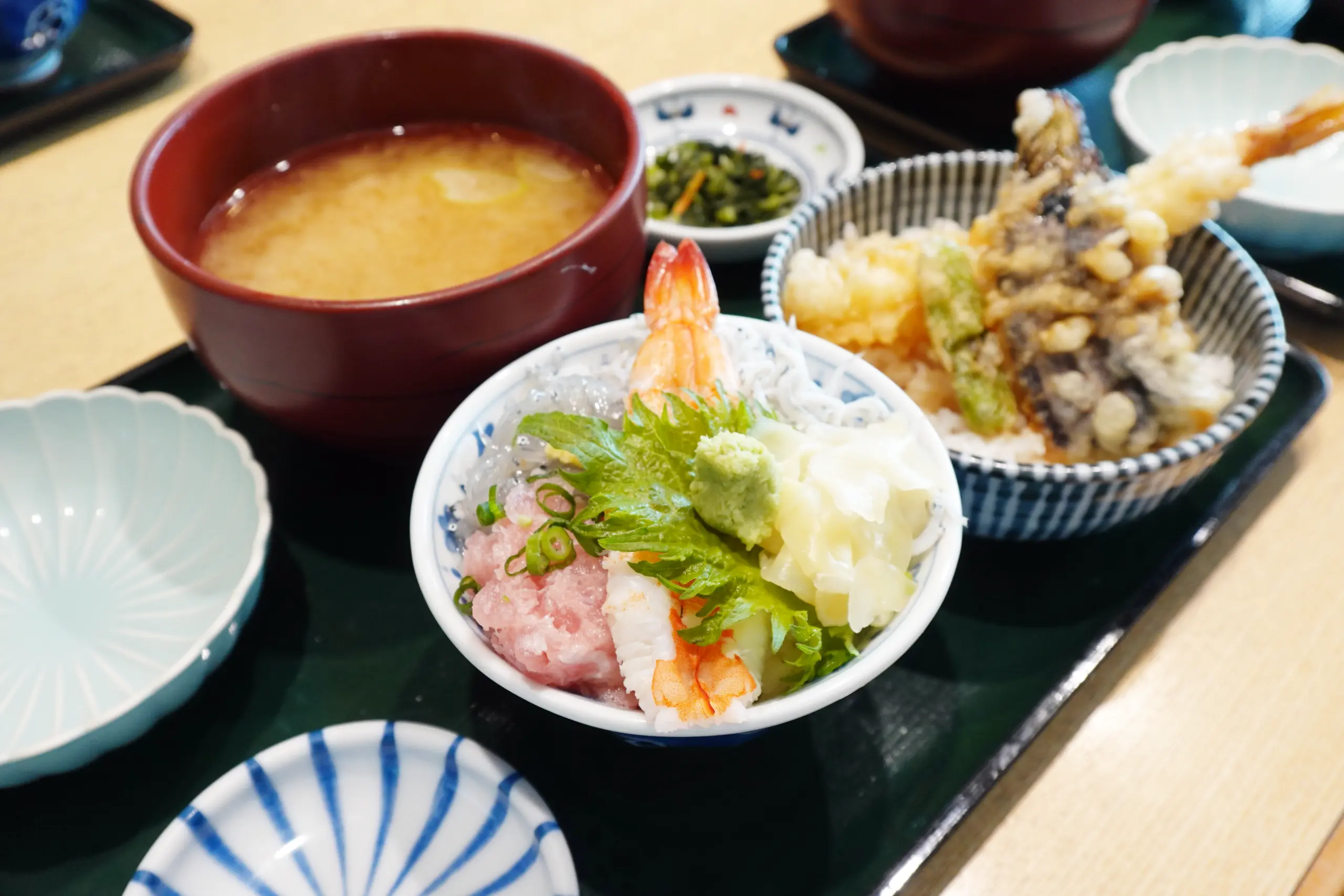 詳細資訊 漁亭濱屋在當地非常的熱門,無論平假日用餐時間都需要排隊,主打漁港直送海鮮,有6間分店,其中1間是蕎麥麵專賣店,閖上河城露台店假日用餐時間也需要耐心候位,海鮮丼跟各式定食都很熱門,我點的是迷你海鮮丼+迷你天婦羅丼,海鮮丼裡有名取市的特產吻仔魚,很少見一碗裡面有生跟熟兩種吻仔魚,其他海鮮也相當好吃,而且價格超實惠1815日幣,折合台幣約363元。