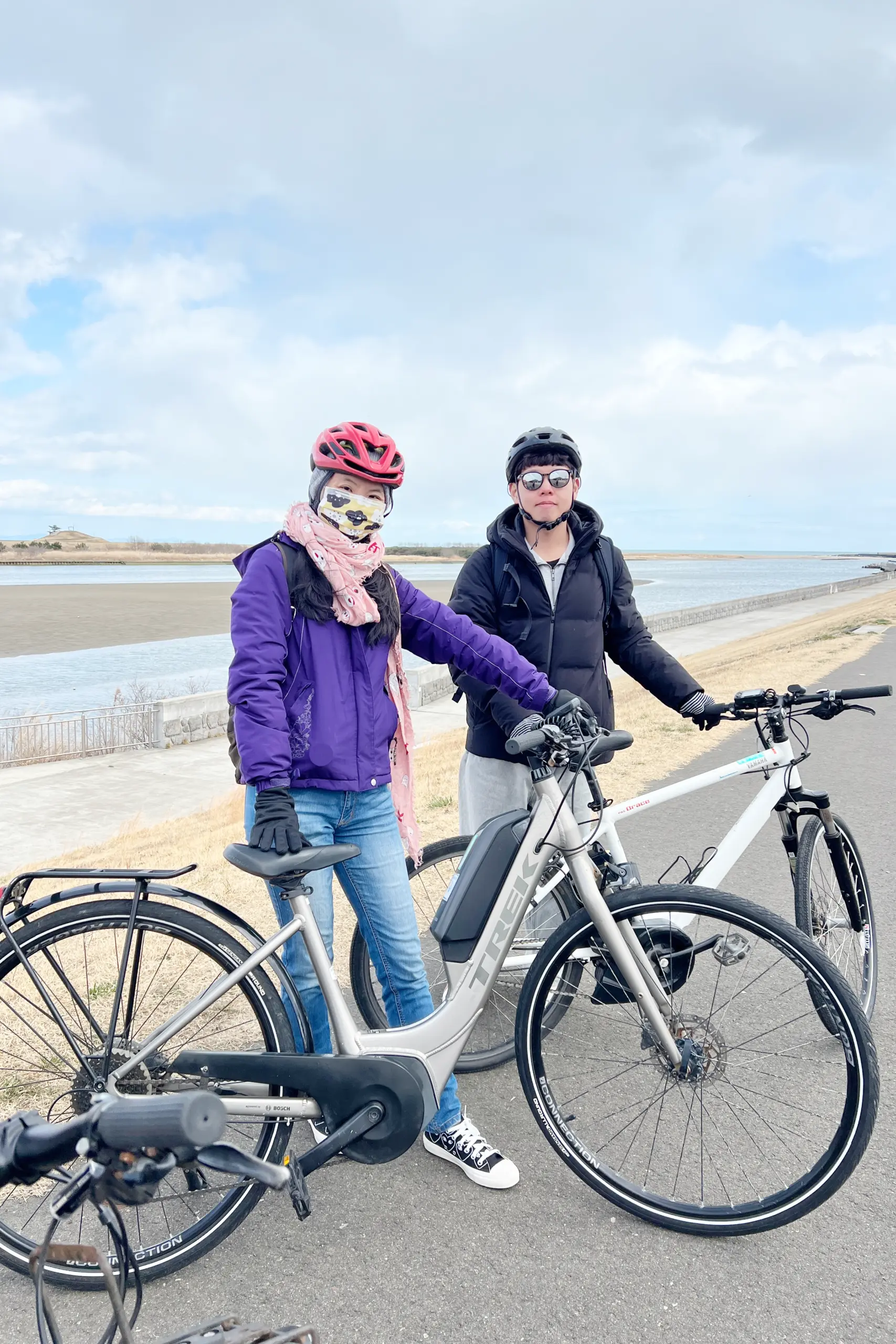 三天兩夜我們都下塌~名取ゆりあげ温泉輪りんの宿,隔壁就是名取市自行車運動中心,很方便租借自行車遊名取,提供多種腳踏車租借服務,從一般城市車到運動型自行車都有,我當然租電動版、騎起來比較輕鬆。也有提供小孩的自行車跟裝備租借。從這裡出發,沿著平坦的道路騎往閖上地區,沿途風景開闊,騎起來非常舒服,即使平常不太騎腳踏車的人,也能輕鬆完成這條路線。