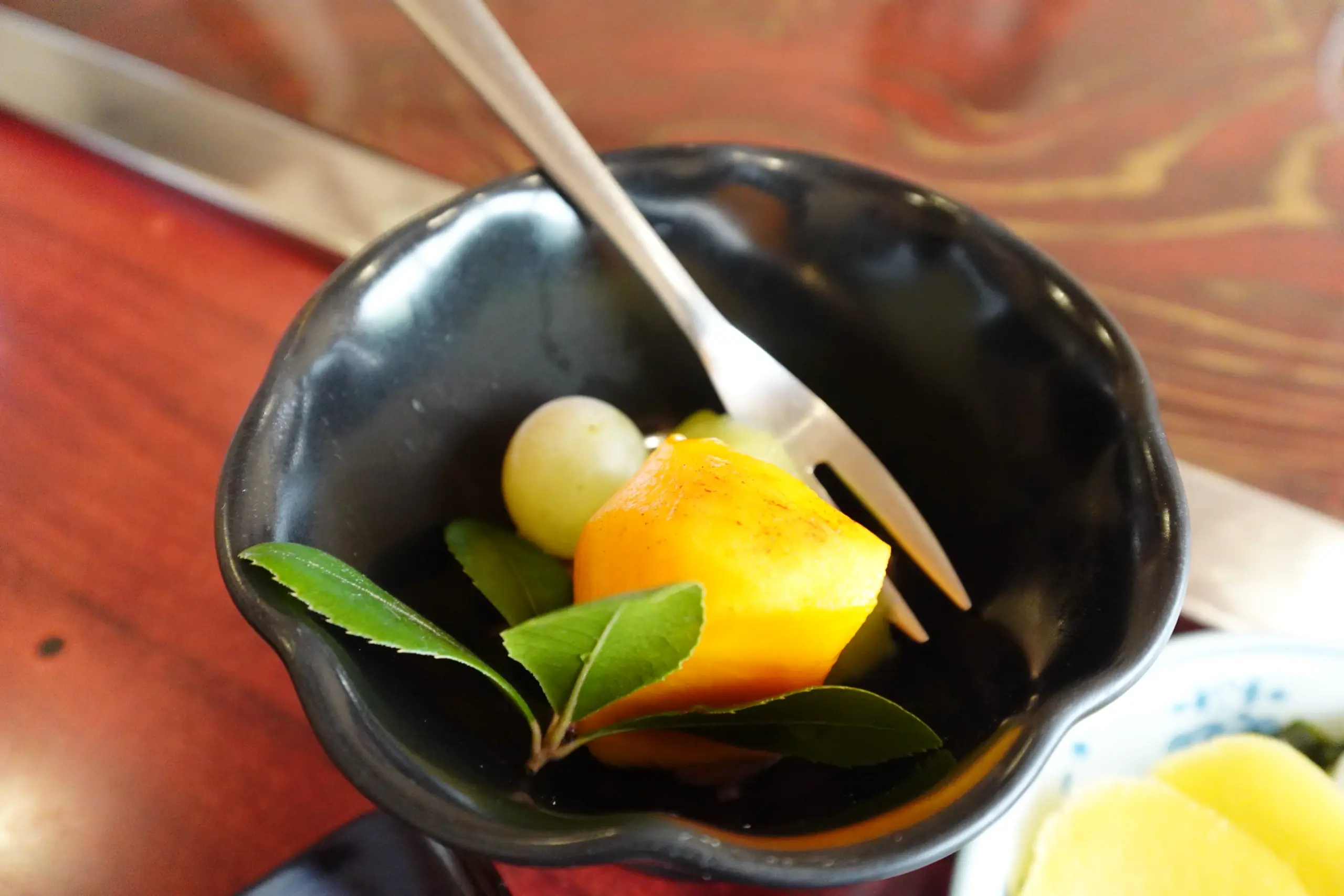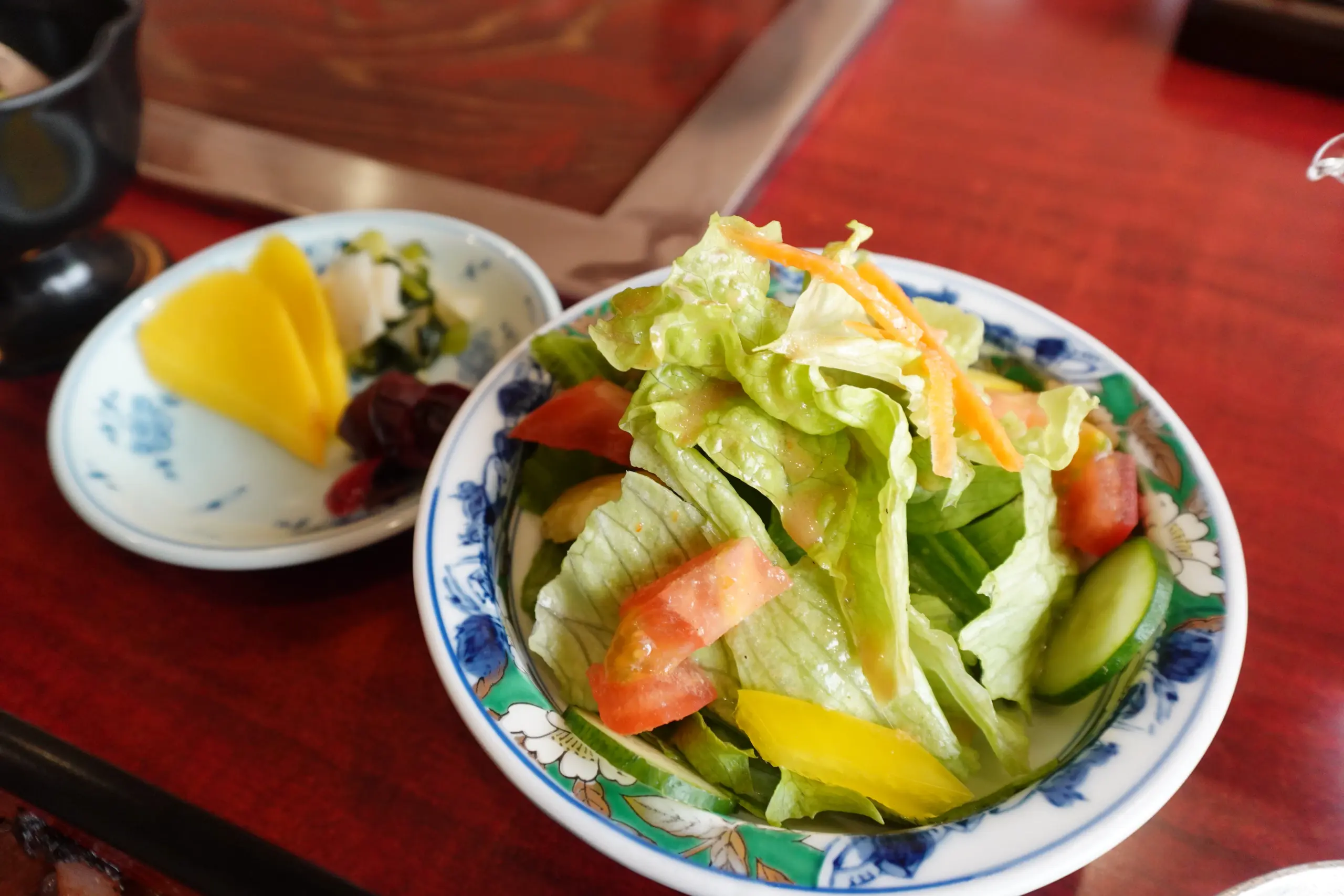 套餐還有附生菜沙拉、漬物、味噌湯跟超甜的柿子,
