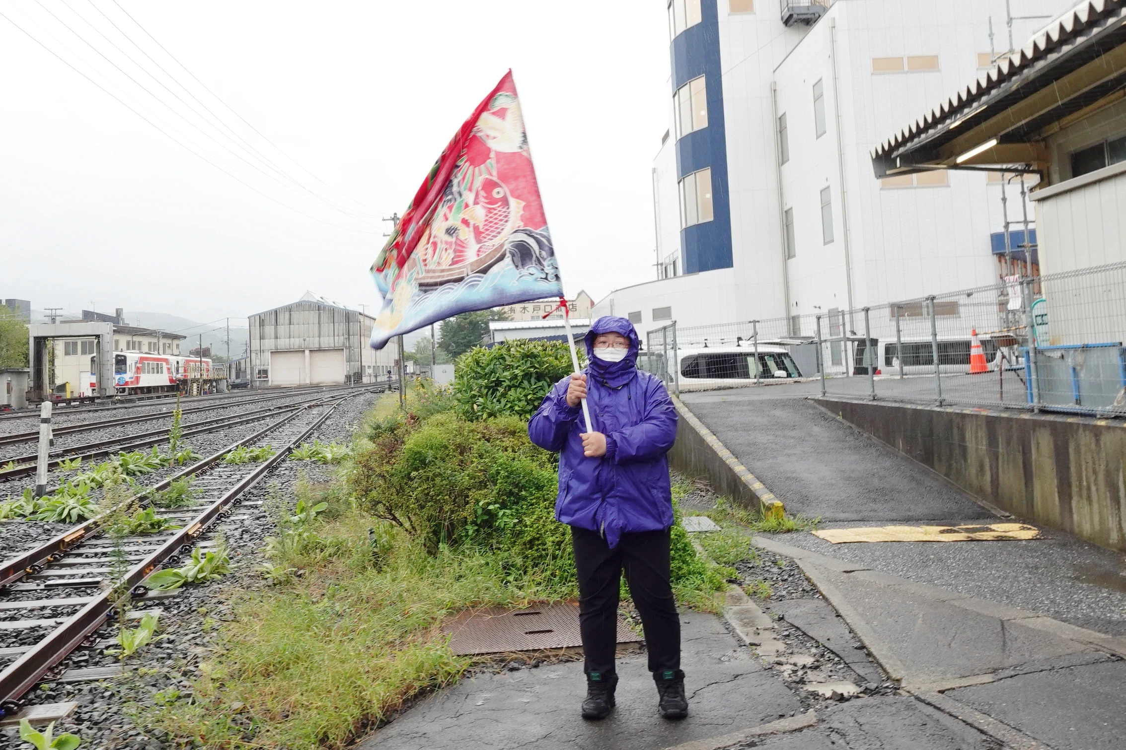 沿途有在地人舉旗歡迎來到青森八戶搭乘TOHOKU EMOTION~