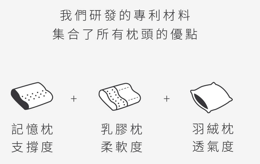 以及集合了記憶枕、乳膠枕跟羽絨枕的優點。